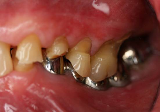어금니가 많이 무너진 상태로 앞니까지 망가지고 있는 상태입니다. 이런 경우 조심스럽게 치료에 접근해 나가야 하는데요